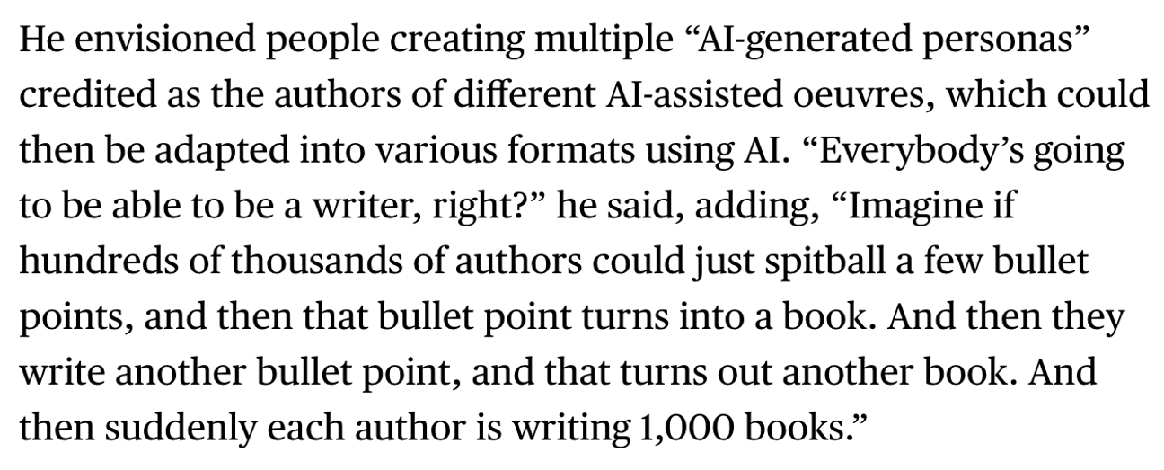 The company recently raised $37 million, with backers including former CEOs of Sony, Penguin, and HarperCollins, proving once again that publishing loves a disruptor… as long as it disrupts creatives, not capital. And more AI companies are mushrooming up to chase the same vision: “a vision of human-created art becoming the raw material for AI-powered, corporate-owned content-production machines—a scenario in which humans would play an ever-shrinking role.”